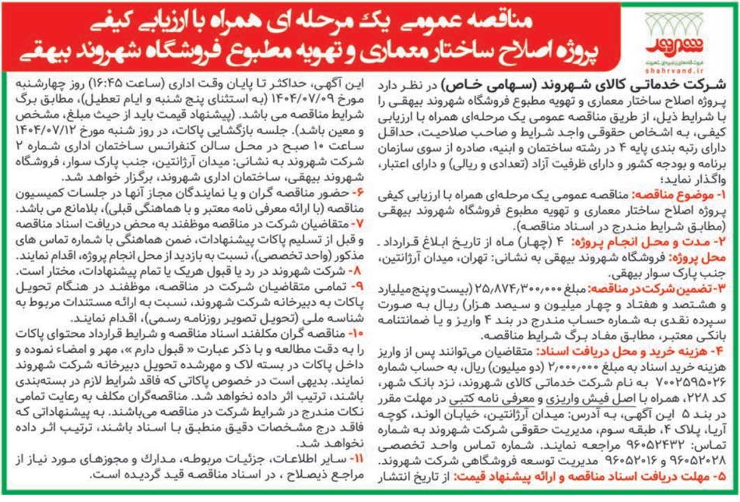 شرکت شهروند به منظور انتخاب پیمانکار اصلح جهت پروژه اصلاح ساختار معماری و تهويه مطبوع فروشگاه شهروند بيهقی مناقصه عمومی همراه با ارزیابی کیفی برگزار میکند.